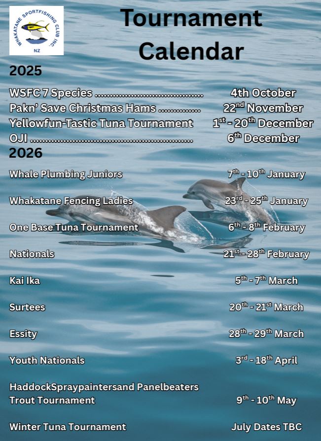 Tournament runs from Saturday 10th May to Sunday 11th May 2025… Fishing commences at 5am on Saturday and concludes at 13:00hrs (1pm) on Sunday. Fishing area is Lake Rotoiti Briefing will be held in the Whakatane Sportfishing Clubrooms on Thursday 8th May at 19:00 hrs...